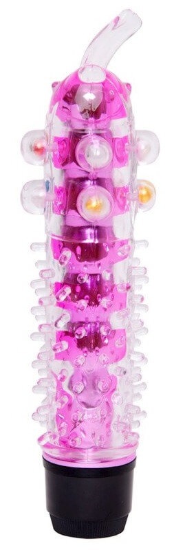Vibrador translúcido com capa texturizada e pérolas para maiores estimulos, feito em Jelly e com vibração multivelocidade.