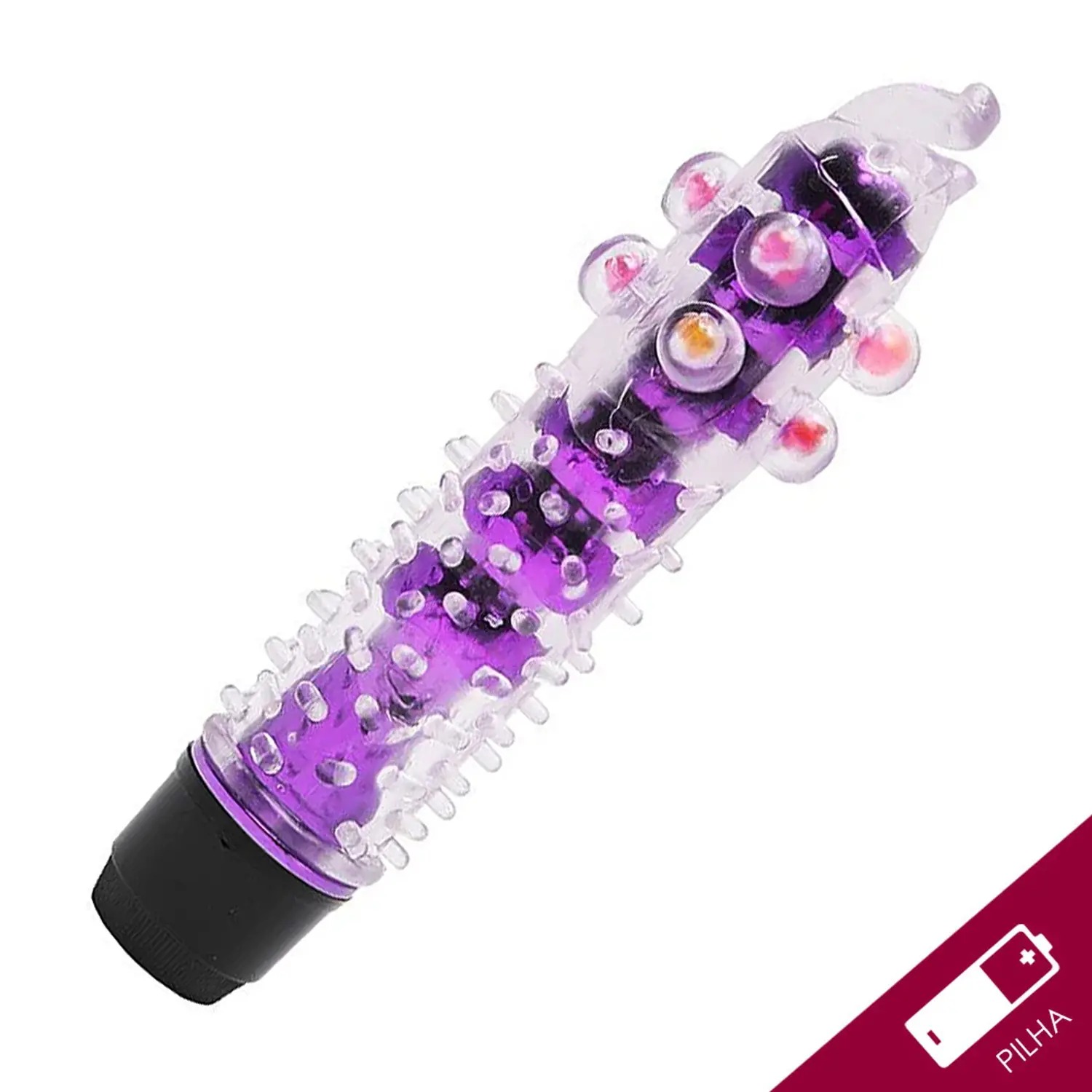 Vibrador translúcido com capa texturizada e pérolas para maiores estimulos, feito em Jelly e com vibração multivelocidade.